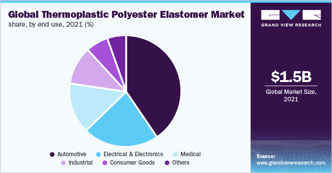 The global thermoplastic polyester elastomer market size was estimated at USD 1.52 billion in 2022 and is expected to grow at a compound annual growth rate (CAGR) of 5.34% from 2023 to 2030. Increasing adoption of lightweight products in several end-use industries including automotive, medical, and consumer goods, among others is expected to boost the market growth over the forecast period. The growing demand for thermoplastic polyester elastomer (TPEE) in electronic devices, electronic housings, gadgets, and others is expected to contribute to the growth of the market. The increasing preferences for lightweight electronics and wearables are expected to propel the demand for TPEE in the coming years.