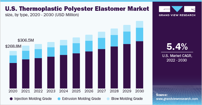 b. The global thermoplastic polyester elastomer market is expected to grow at a compound annual growth rate of 5.34% from 2023 to 2030 to reach USD 2.28 billion by 2030.