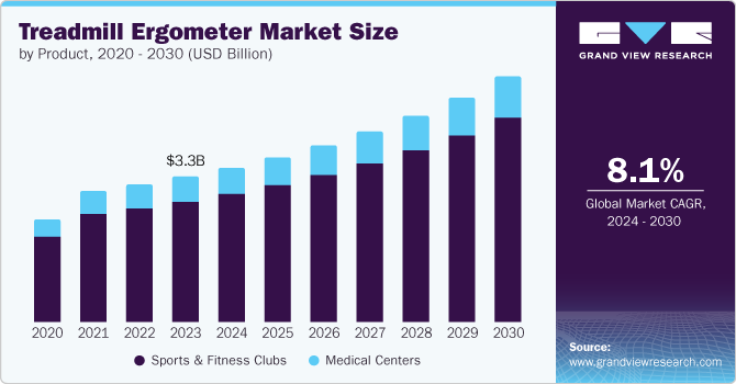 The global treadmill ergometer market size was valued at USD 3.31 billion in 2023 and is projected to grow at a CAGR of 8.1% from 2024 to 2030. Rising popularity of electric gym equipment pertaining to increased adoption of sports and fitness activities is anticipated to drive the growth. Increasing demand for real-time tracking of fitness and athletic performance for evaluating health metrics is expected to further fuel the product demand as this equipment provides personalized feedback. In addition, rising incidence of cardiovascular diseases among the younger population has resulted in increased adoption of cardio exercise, which is expected to boost the demand for treadmill ergometers in near future.