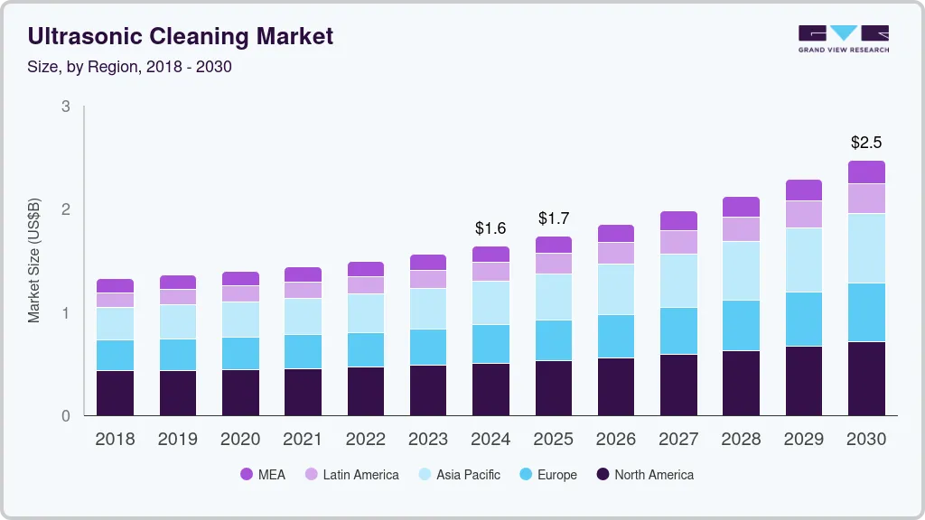 b. The global ultrasonic cleaning market size was estimated at USD 1.64 billion in 2024 and is expected to reach USD 1.74 billion in 2025.