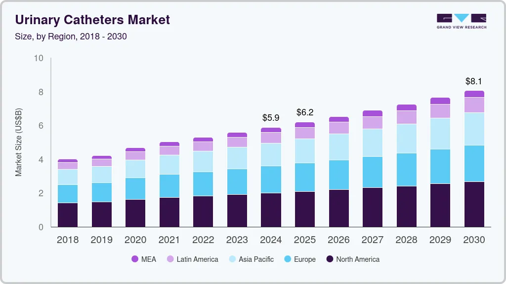 b. Key factors that are driving the urinary catheters market growth include the rising prevalence of urologic diseases, an increasing number of surgical procedures across the globe, rising elderly population, and favorable reimbursement policies.