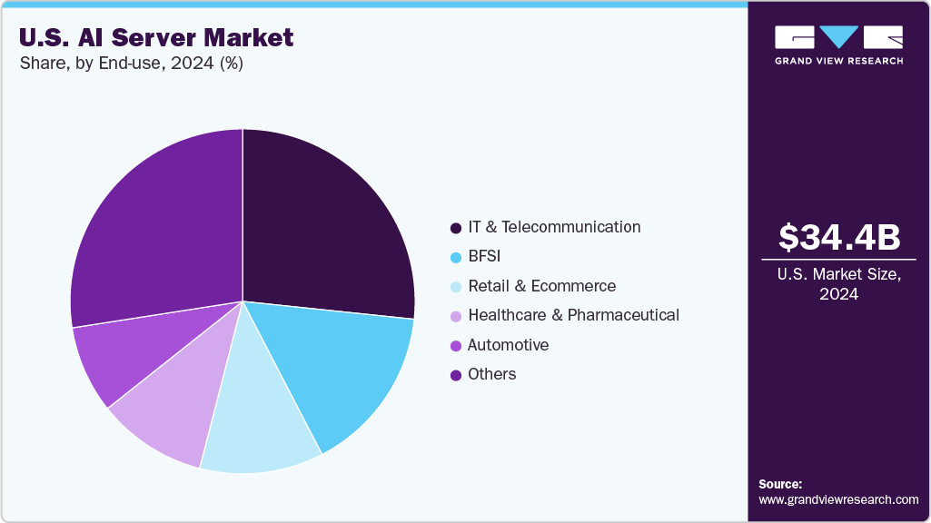 The IT & telecommunication segment led the market with the largest revenue share of 26.60% in 2024, due to enabling intelligent automation, enhancing network performance, and powering next-generation digital services. In 5G and edge computing, AI servers are vital to managing the ultra-low latency and high-bandwidth requirements of modern applications. Deployed at the network edge in Multi-access Edge Computing setups, AI servers support real-time data processing close to the end user. AI servers also enable network slicing in 5G, allowing operators to create multiple virtual networks tailored to different types of users or services on a shared physical infrastructure. For instance, in September 2023, the U.S. National Science Foundation's Directorate for Technology, Innovation and Partnerships (TIP) is investing USD 25 million to address challenges in 5G communication infrastructure and security.
