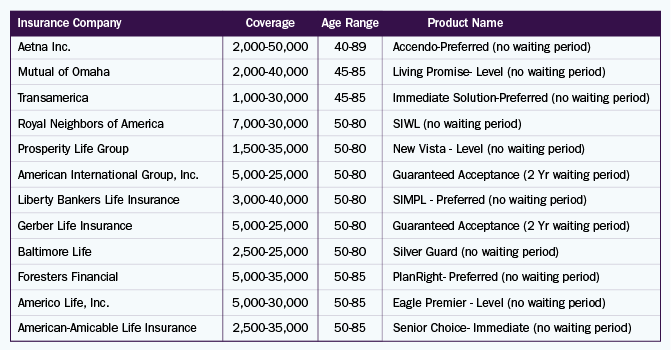 Aetna Inc.; Mutual of Omaha; Royal Neighbors of America; Allianz Life; Gerber Life Insurance; Baltimore Life; Foresters Financial Services Inc (acquired by Nassau Financial Group, L.P. also known as ‘Nassau’); Globe Life Inc. (Globe Life and Accident Insurance Company); Fidelity Life Association; Colonial Penn
