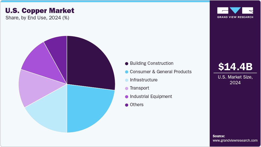 The building construction segment accounted for the highest revenue share in 2024. Copper has long been a favored material due to its durability and visual appeal in the building and construction sector. It is commonly used in roofing, spires, shingles, doors, and architectural details. Designers and architects are especially drawn to copper for its natural oxidation process, which creates a distinctive green and blue color over time. This not only enhances its aesthetic value but also forms a protective layer that resists corrosion, increasing the material’s lifespan in both historic and modern structures.