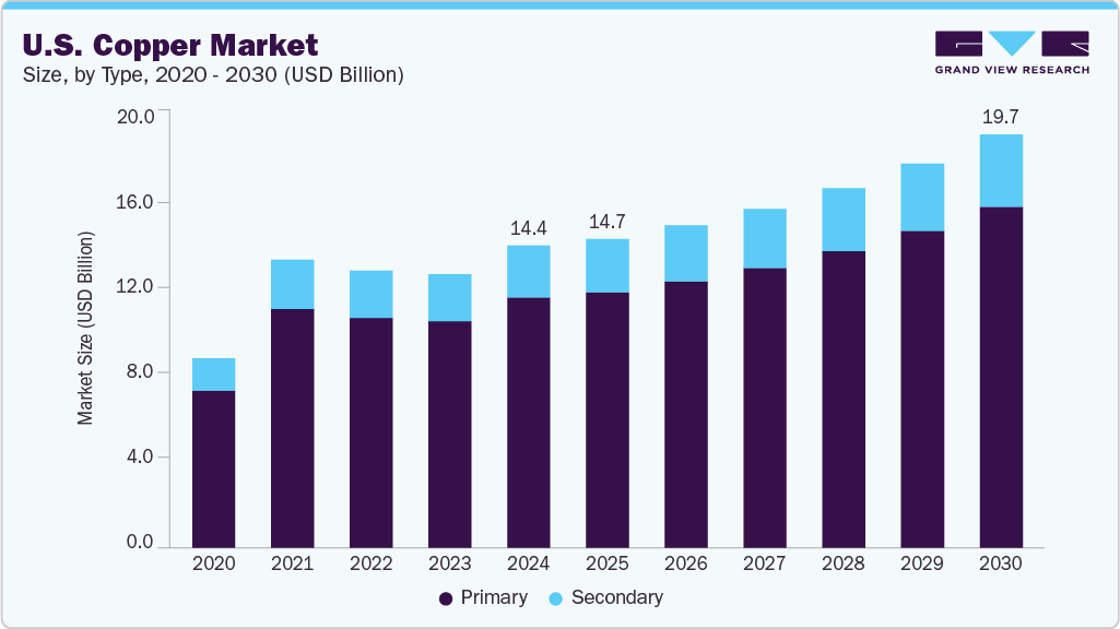 b. The U.S. copper market size was estimated at USD 14.39 billion in 2024 and is expected to reach USD 14.70 billion in 2025