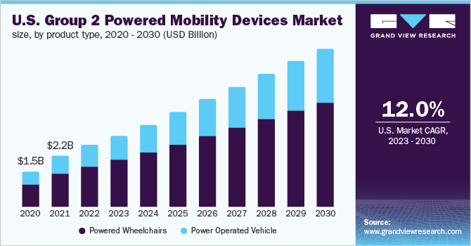 b. The U.S. group 2 powered mobility devices market is expected to grow at a compound annual growth rate of 12.0% from 2023 to 2030 to reach USD 6.7 billion by 2030.