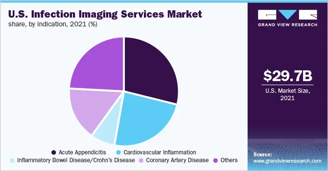 b. The acute appendicitis segment dominated the market for U.S. infection imaging services and accounted for the largest revenue share of 24.06% in 2021 and is further expected to continue its dominance over the forecast period.