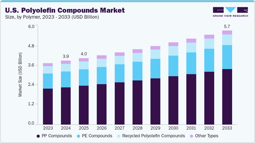 b. .The U.S. polyolefin compounds market size was estimated at USD 3.87 billion in 2024 and is expected to reach USD 4.03 billion in 2025.