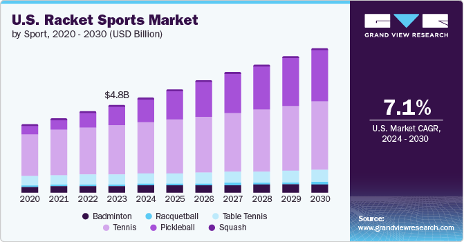 b. The U.S. racket sports market is expected to grow at a compound annual growth rate (CAGR) of 6.8% from 2025 to 2030 to reach USD 7.74 billion by 2030.