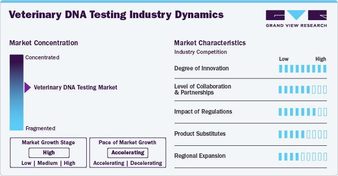 The veterinary DNA testing industry is experiencing high growth, driven by rapid advancements in diagnostics and increased R&D investments by key players. The market is primarily consolidated but expected to move towards fragmentation, with significant and upcoming minor players focusing on new product development and collaborations with research institutions. These partnerships enhance market presence and expand the availability of DNA testing solutions. Key players are also expanding globally to tap emerging markets and capitalize on growing awareness of veterinary diagnostics. Overall, the market's growth is influenced by technological advancements and strategic collaborations.