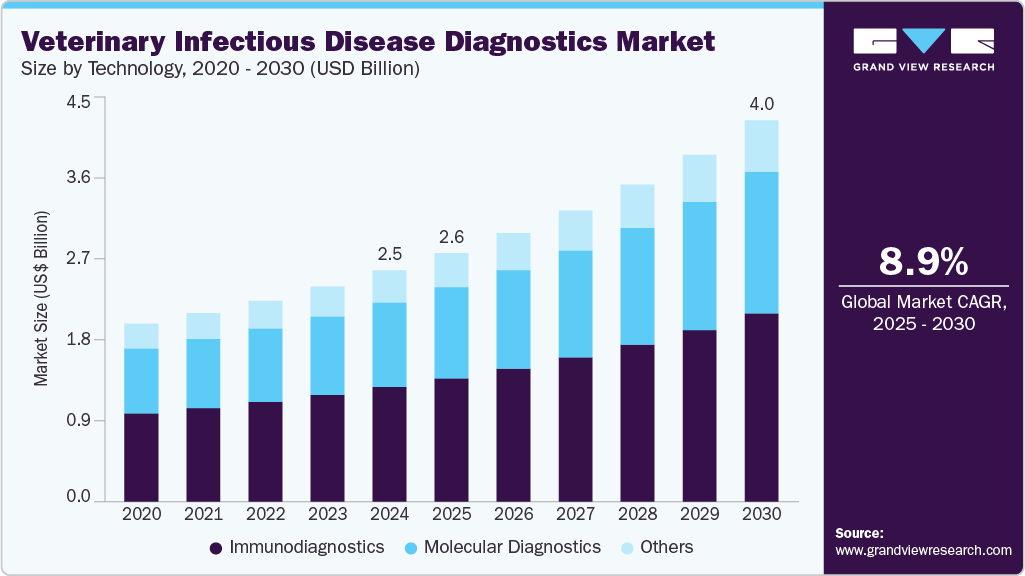 b. The global veterinary infectious disease diagnostics market is expected to grow at a compound annual growth rate of 8.93% from 2025 to 2030 to reach USD 4.05 billion by 2030.