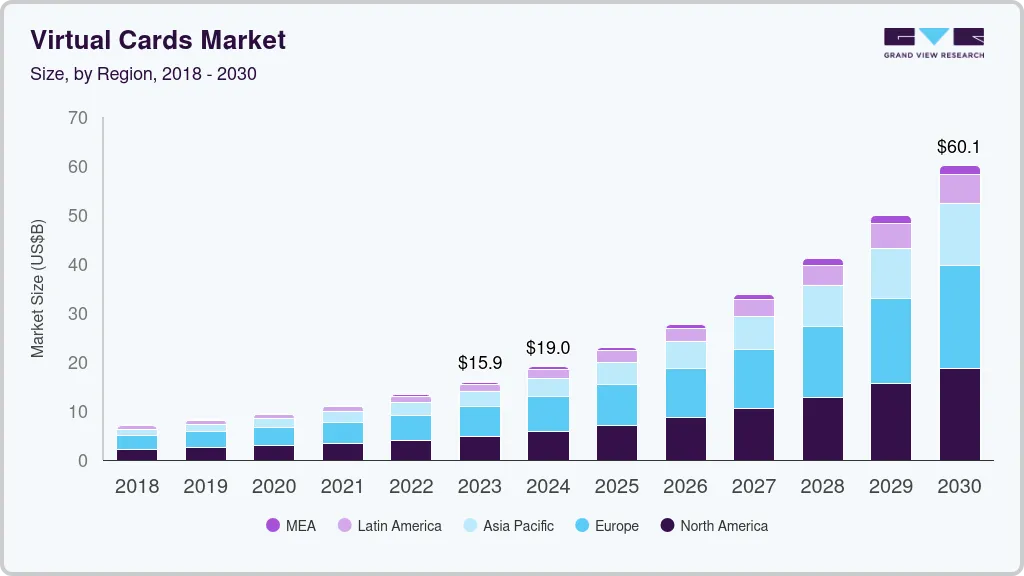 b. The global virtual cards market is expected to grow at a compound annual growth rate of 21.2% from 2025 to 2030 to reach USD 60.06 billion by 2030.