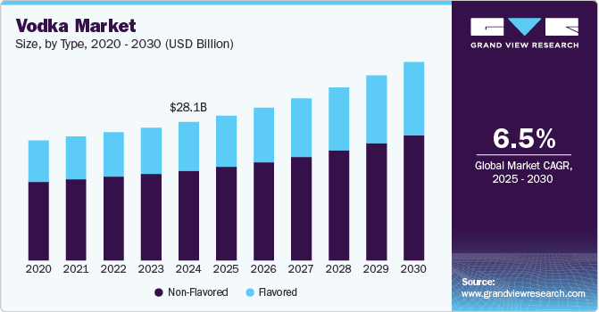 b. The global vodka market is expected to grow at a compound annual growth rate of 6.5% from 2025 to 2030 to reach USD 40.25 billion by 2030.
