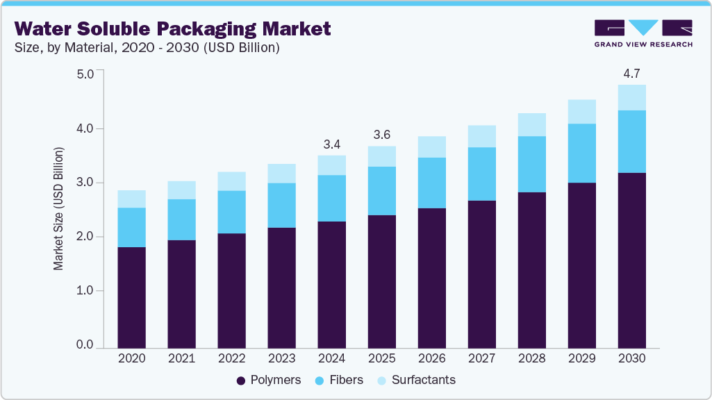 Water Soluble Packaging Market (2025 - 2030) Size, Share & Trends Analysis Report by Material (Polymers, Fibers, Surfactants), By Product (Bags, Pouches), By Solubility Type, By End-use (Household Products, Agriculture, Medical, Retail), By Region, And Segment Forecasts