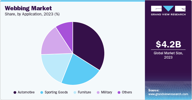 Automotive applications dominated the webbing market with a market share of 34.0% in 2023. Stringent regulations on safety by governments worldwide have driven the adoption of automotive webbing applications. Regulatory bodies, such as the U.S.’ National Highway Traffic Safety Administration, have established strict guidelines for automotive safety. As a result, manufacturers are compelled to utilize high-quality, safe webbing materials that meet these specifications to ensure compliance and maintain consumer trust.