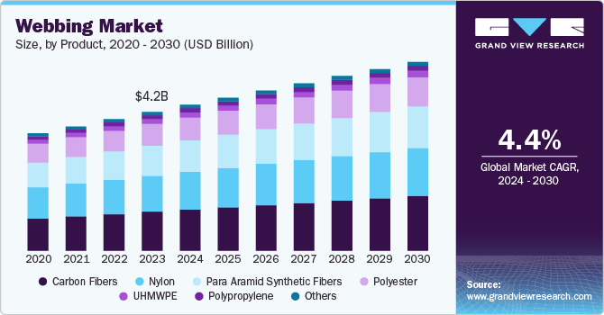 The global webbing market size was valued at USD 4.17 billion in 2023 and is projected to grow at a CAGR of 4.4% from 2024 to 2030. Factors driving market growth include stringent automotive safety regulations, industrial growth, military demands for durable fabrics, technological advancements in webbing products, and increased recreational activities. Moreover, the trend towards sustainable and eco-friendly solutions is fueling demand for green webbing initiatives.
