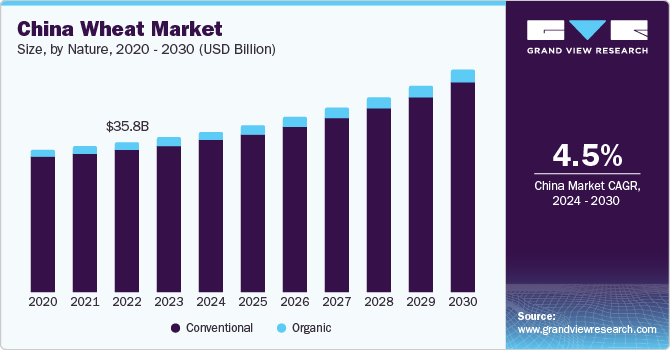 The global wheat market size was estimated at USD 195.99 billion in 2023 and is projected to reach USD 270.88 billion by 2030, growing at a CAGR of 4.28% from 2024 to 2030. Wheat is a popular ingredient in many global cuisines and is a primary source of carbohydrates and essential nutrients.