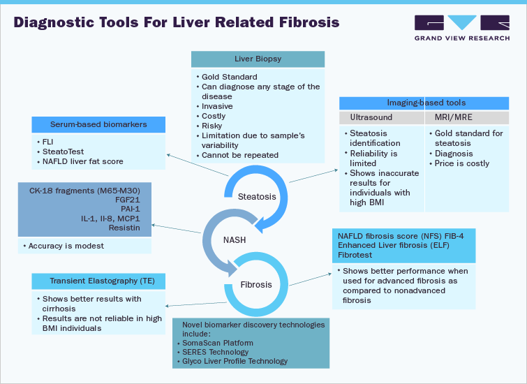 The serum biomarkers segment held the largest market share of 33.15% in 2021 which is attributed to associated benefits such as its ability to distinguish simple steatosis from NASH coupled with efficient outcomes. Such advantages can reduce the need for liver biopsy, which provides added advantages compared to other types of biomarkers available. Noninvasive serum biomarkers favor patients and physicians more in a dynamic clinical practice since they are easier, more accessible, & repeatable. Numerous novel biomarkers are discovered in experimental and clinical trials, with an increasing understanding of fibrosis pathophysiology. Increasing evidence supports the biological functions of Extracellular Vesicles (EVs) and non-coding RNAs (ncRNAs) in liver fibrosis. Before they can be utilized as accurate serum biomarkers of liver fibrosis, many miRNAs are still in the in vitro investigation phase and require extensive clinical efficacy evaluations.
