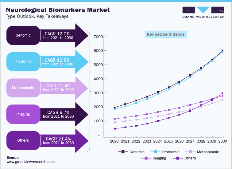 The global neurological biomarkers market was valued at USD 6.85 billion in 2021 and is anticipated to witness growth at a rate of 12.8% over the forecast period. Proteomic biomarkers are useful as high functional implications of several post-translational modifications cannot be concluded from mRNA expression. In that case, proteomic biomarkers are required for accurate diagnosis of disease onset and progression due to the careful detection of protein signatures and post-translational modifications. These have been very useful for the identification of underlying cellular changes involved in multifactorial and idiopathic diseases such as AD.