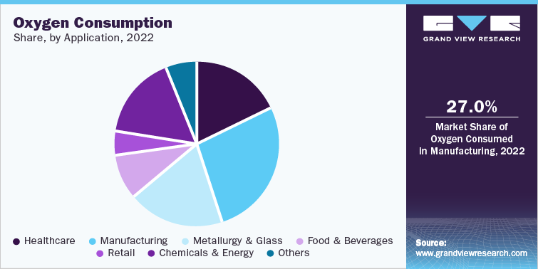 Manufacturing application accounted for the largest market share in 2022 and is projected to grow at second highest CAGR during the forecast period. The demand for oxygen in the manufacturing industry is projected to witness substantial growth in the developing economies owing to the growing manufacturing industry such as electronics, transportation, food, and chemicals in India, China, Brazil, and South Korea. The growing demand for advanced industrial gas- in the electronic industry, is expected to further propel the growth of this segment. Oxygen is used on a large scale in the electronic industry. The growing electronic industry is expected to drive the demand for oxygen. Moreover, owing to the recent outbreak of the pandemic, people around the world are practicing new ways of studying, working, and communicating through videoconferencing and other technologies. This recent trend is expected to have a lasting impact on semiconductor demand and open new possibilities for existing products and services thus driving the demand.